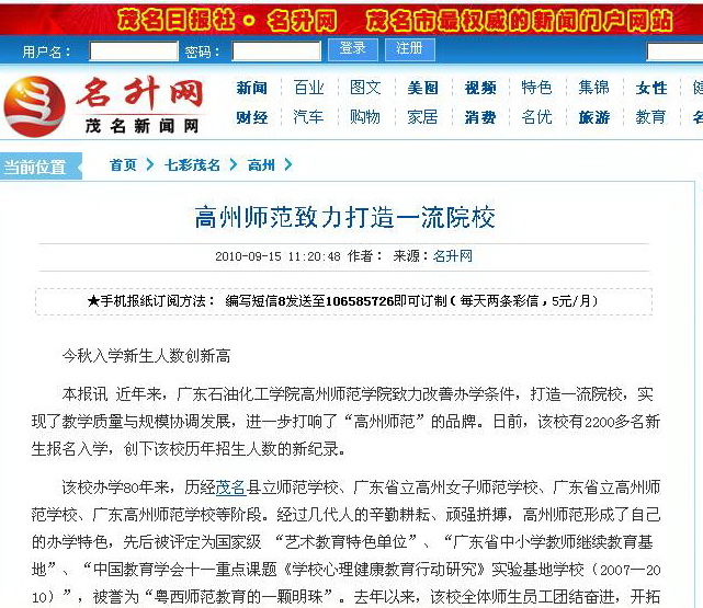 本报讯 近年来,广东石油化工学院高州师范学院致力改善办学条件,打造一流院校,实现了教学质量与规模协调发展,进一步打响了“高州师范”的品牌。日前,该校有2200多名新生报名入学,创下该校历年招生人数的新纪录。