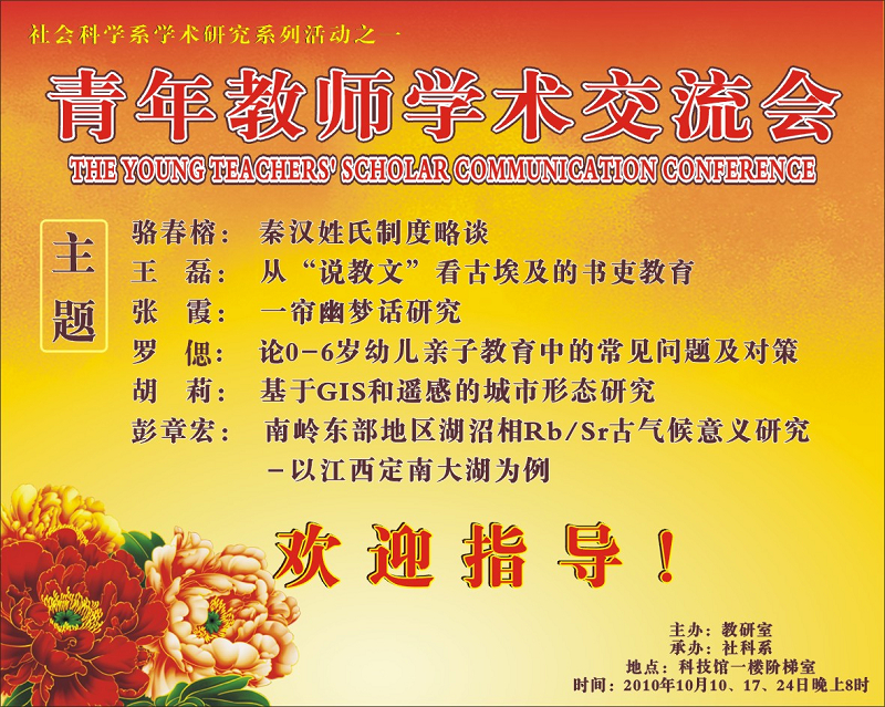 为进一步提高社会科学系专业特色,深化学生的专业知识学习,提升学生的专业学术研究能力,社会科学系于2010年10月10日至19日举行了青年教师学术交流系列专业讲座,分别由社科系王磊、张霞、罗�、胡莉、彭章宏等5位青年教师为社科系相关专业师生作专业学术讲座。学校韦厚升副院长、教务科林国富主任、黄辉副科长、教研室江肇清主任、招就办李德伟副科长、英语系傅冰玲主任、谢宝清书记、张光妃老师、社科系李坤凤主任、黎雪琼书记及相关专业教师也出席聆听了部分讲座。