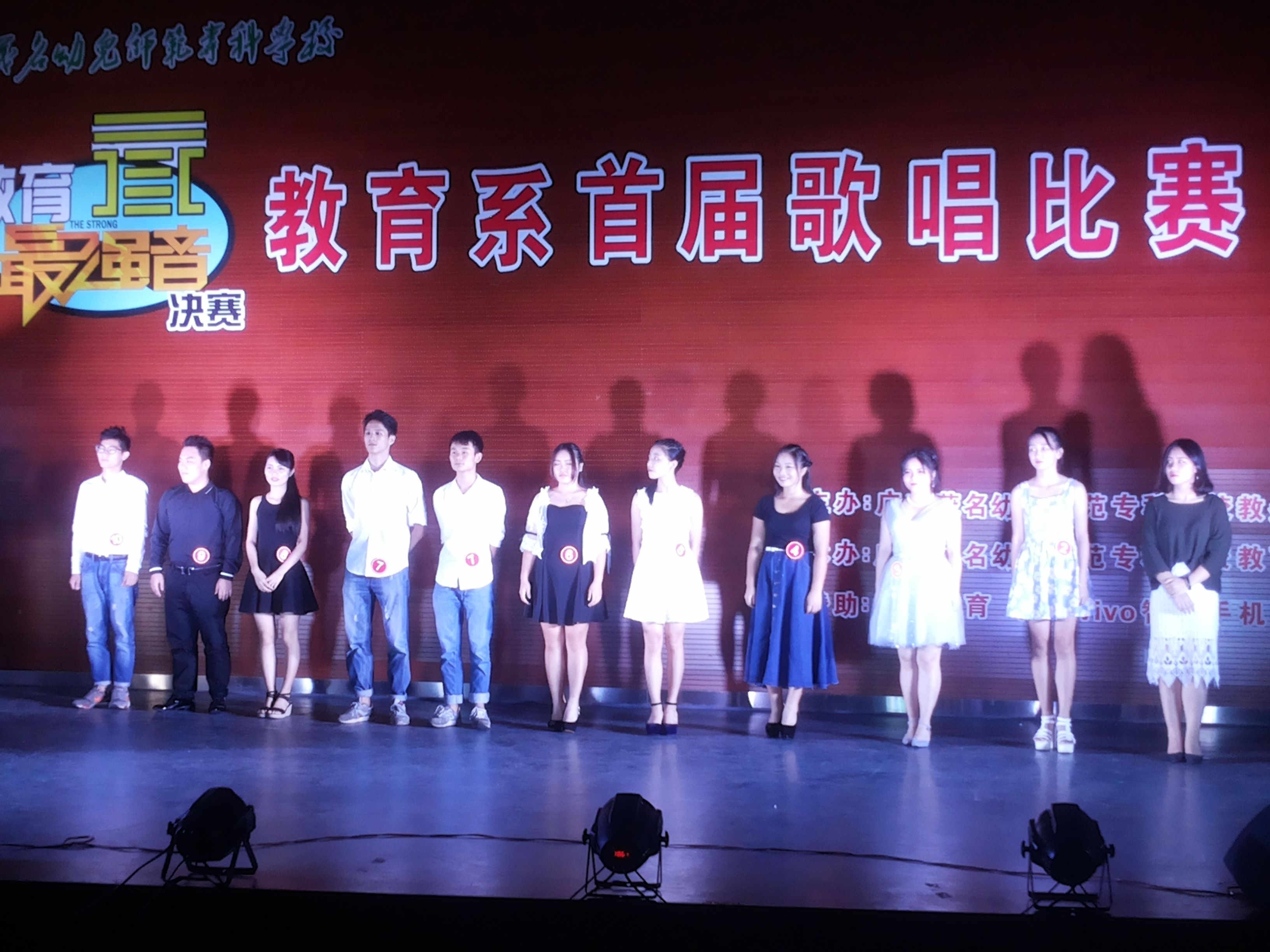 拼搏学前,梦想无限,勇于创新,不断发展!经过海选赛、入围赛和半决赛的角逐,雷玉婷、李莉莉、蔡晓娣、潇泽华、吴华力组合、骆小珍、曾蓉、卢艺斌、王子玮、王怡玲等十位选手(组合)成功闯入“教育最强音――教育系首届歌唱大赛”总决赛。2016年05月29日晚7:30许,“教育最强音――教育系首届歌唱大赛”总决赛在茂名校区小礼堂隆重举行。吴东、龙瑞兰等学校领导、茂名校区各科室(系)领导老师及教育系师生共计400余人现场欣赏了精彩的赛事。