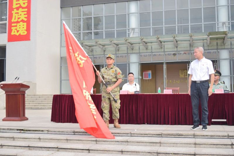 (党委书记余义才为军训团授旗)