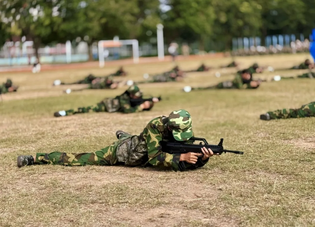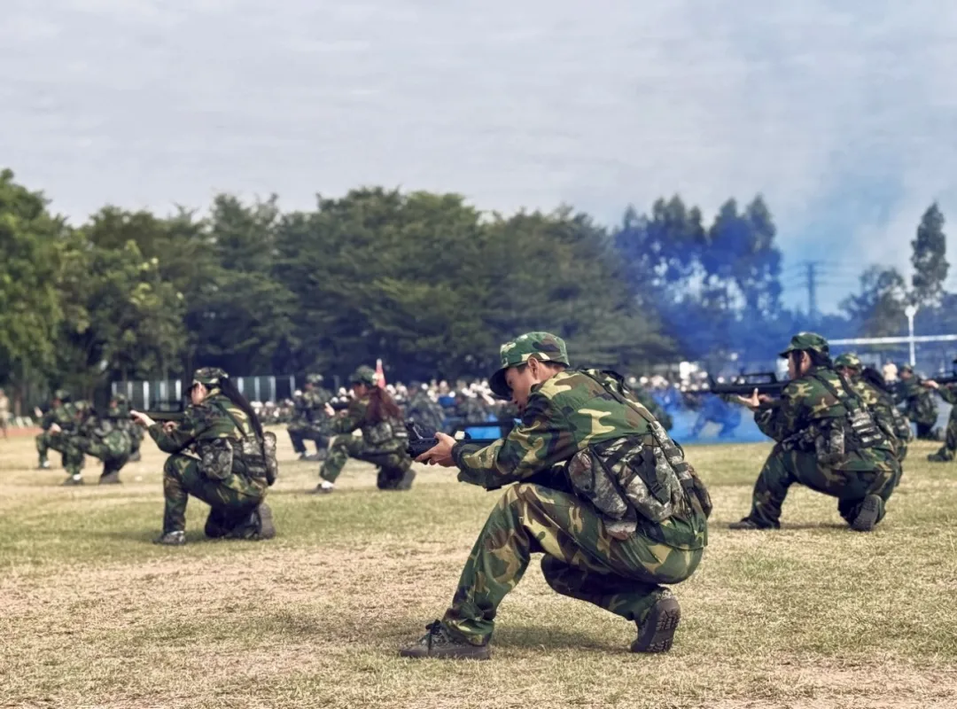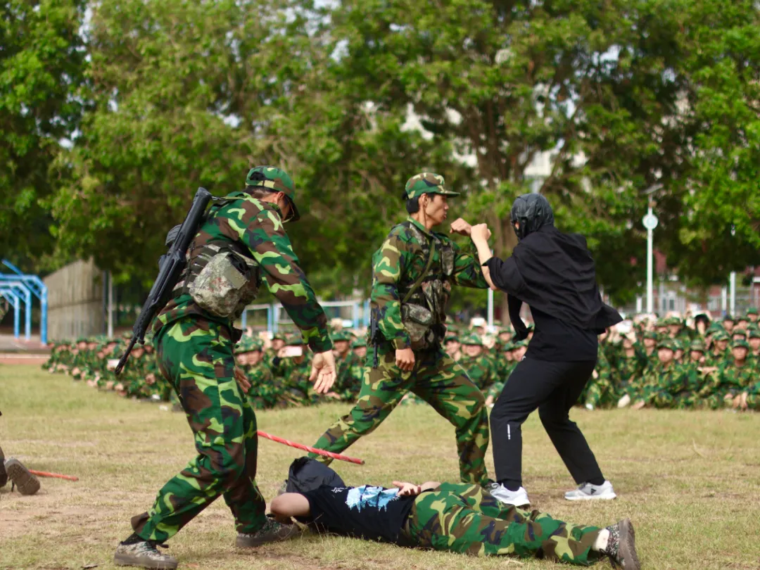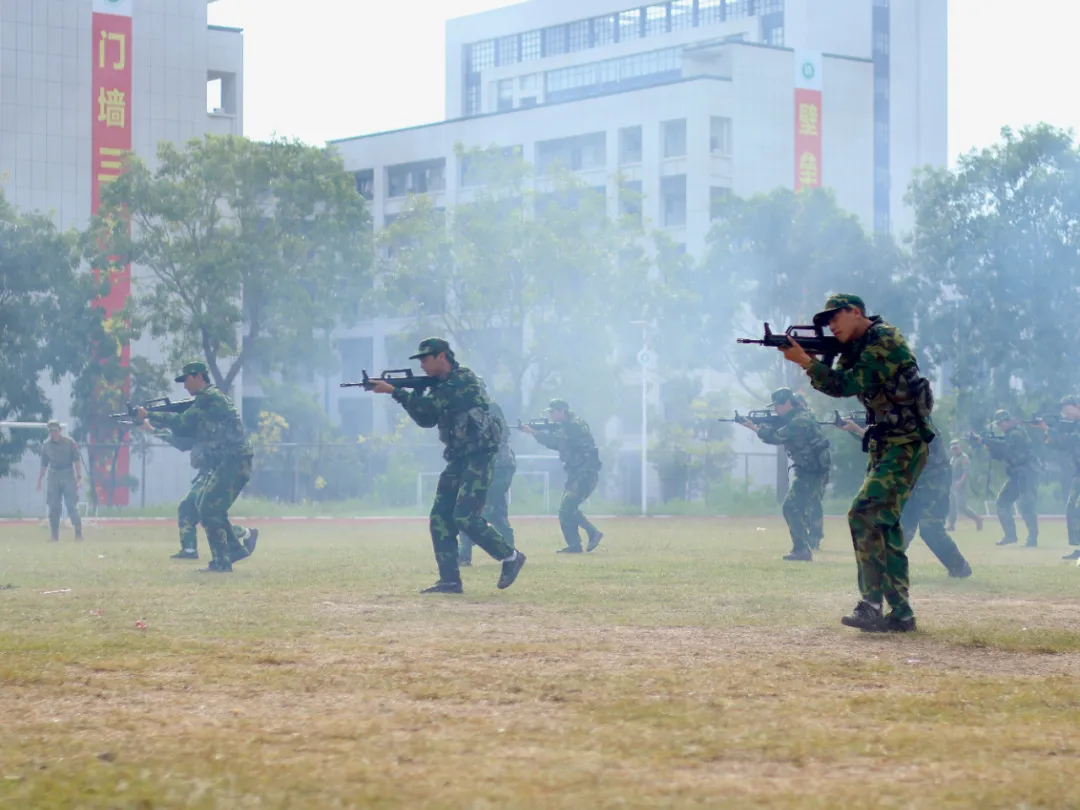 反恐救援演练:迷彩小队如离弦之箭突入 “现场”、学子们挺拔身姿间满是锐气、疾跑、掩护、警戒动作无缝衔接、默契配合 精准突击、青春热血在默契配合中迸发