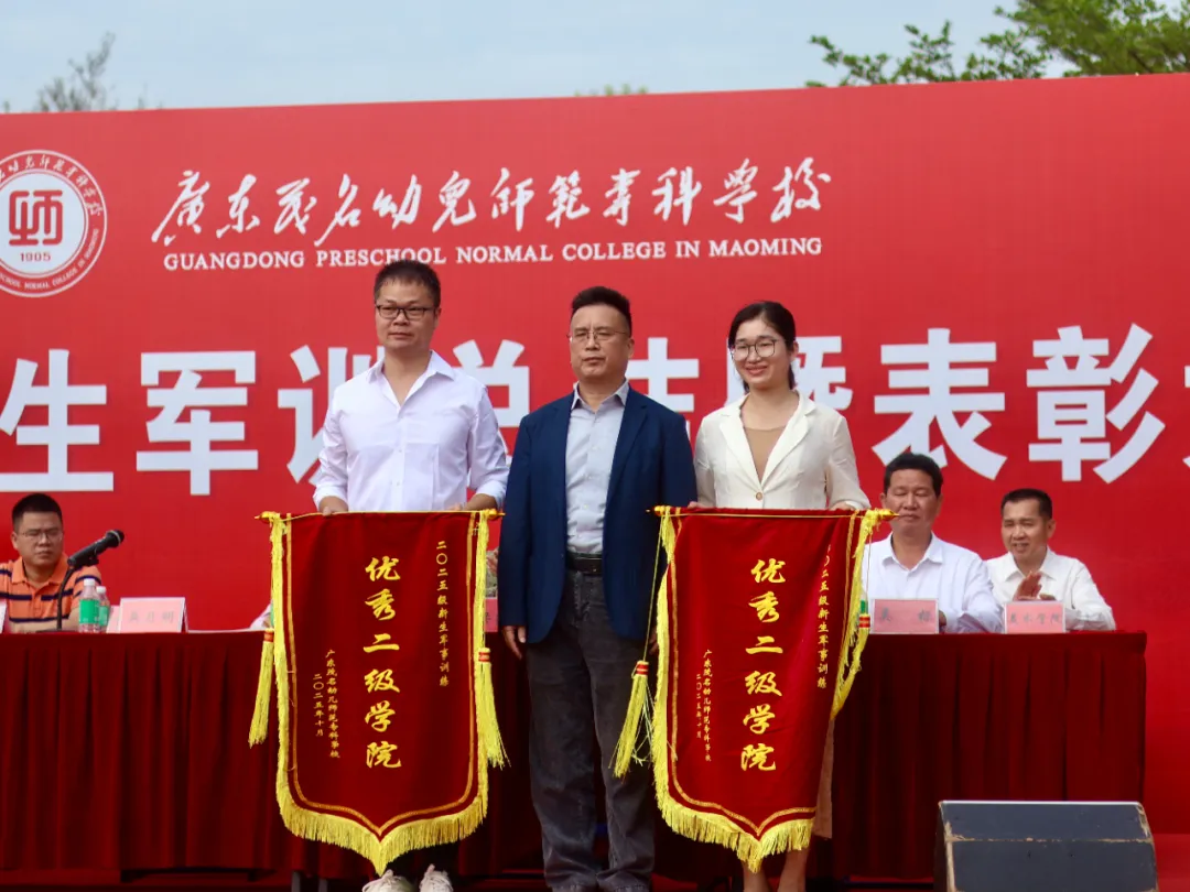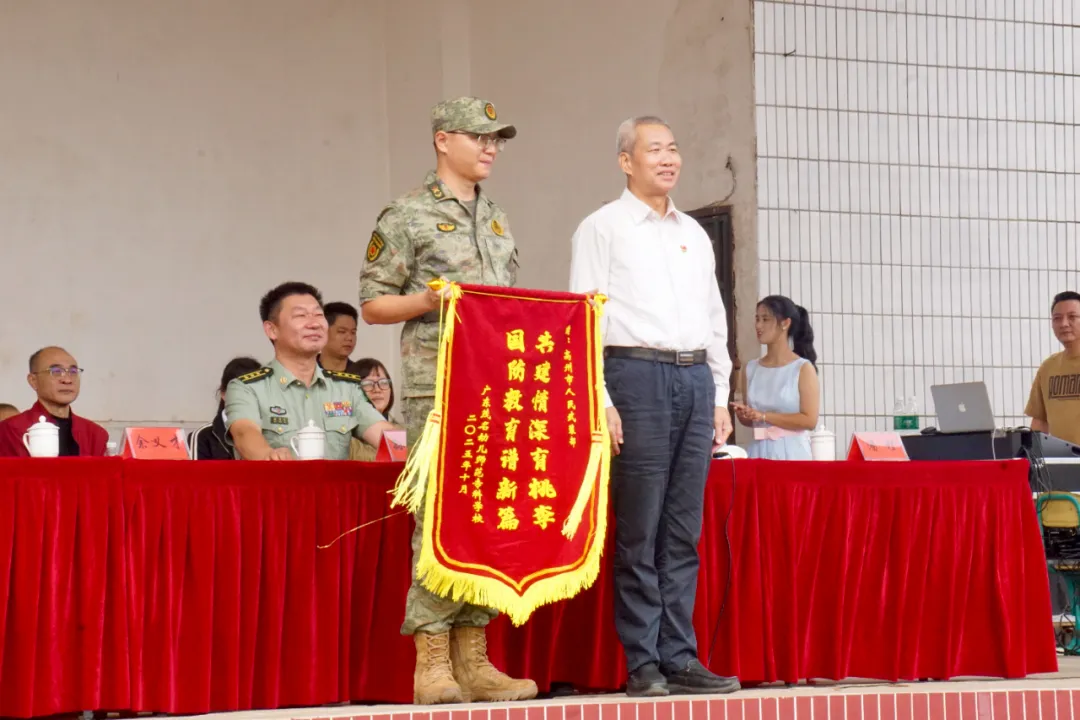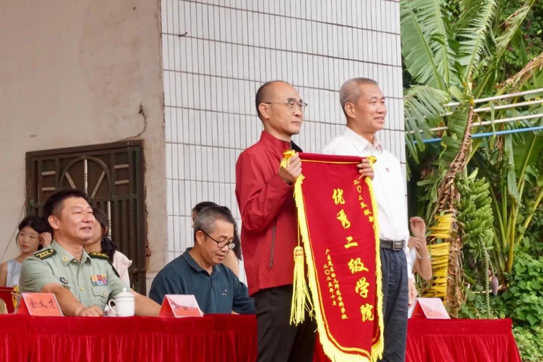 参会领导为优秀学院、优秀班集体以及优秀个人颁奖,为高州市人民武装部和茂南区人民武装部赠送了锦旗。