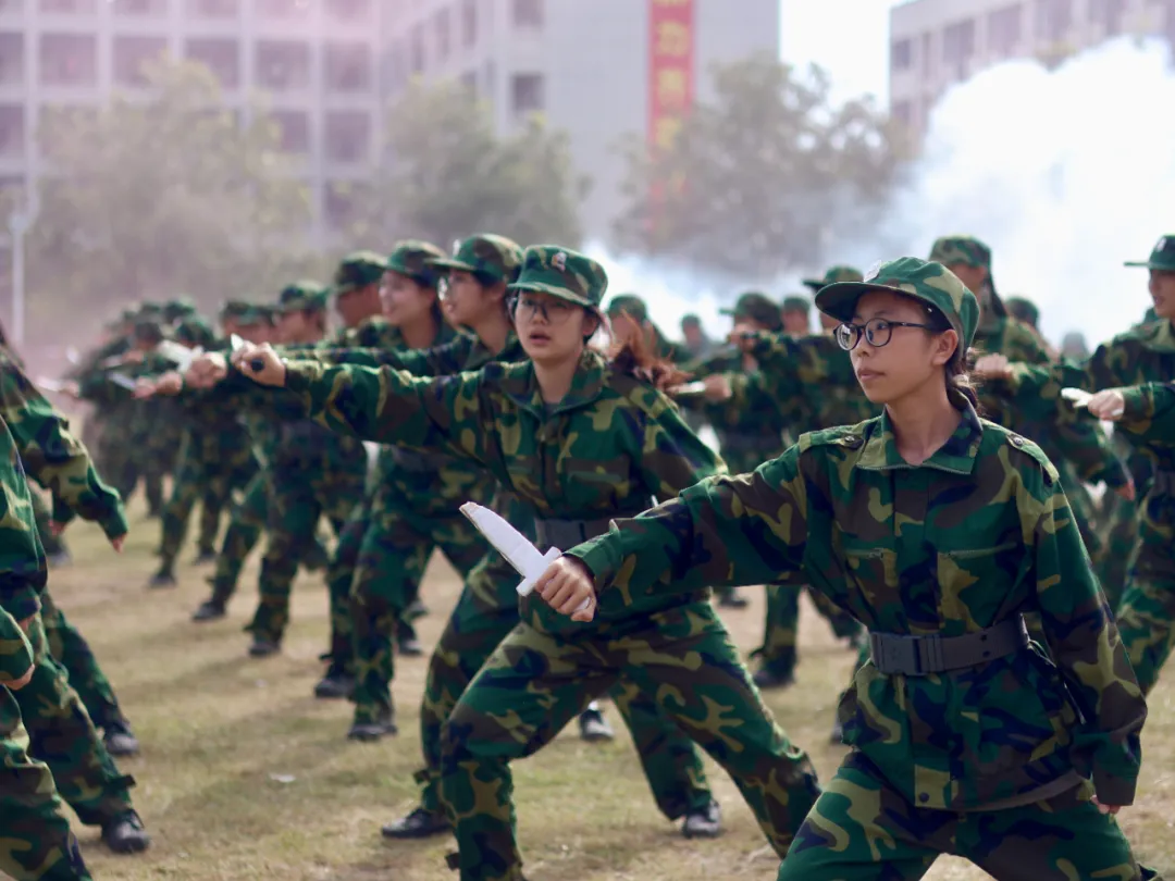 匕首操 :目光如炬亮锋芒 少年意气眉间藏、挥刺劈挡不含糊 动作利落劲满腔、学子们把娇柔换成了骨子里的刚、青春朝气在训练场漫开、展现广茂幼师学子的精气神