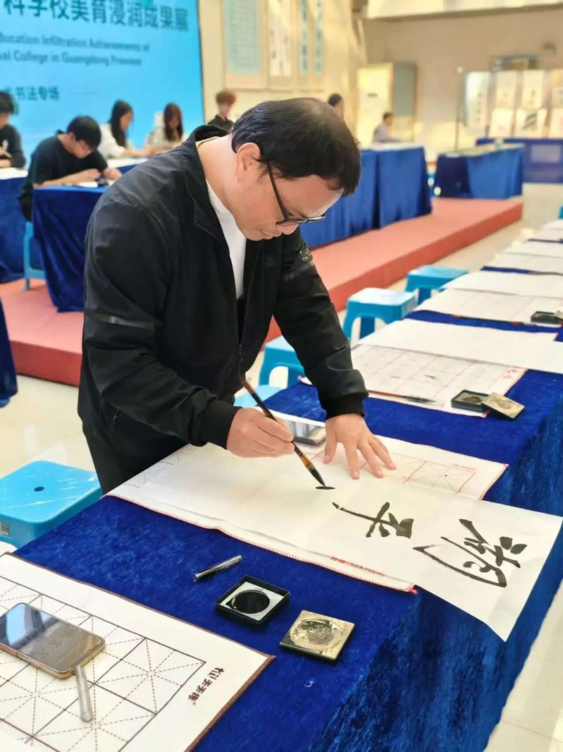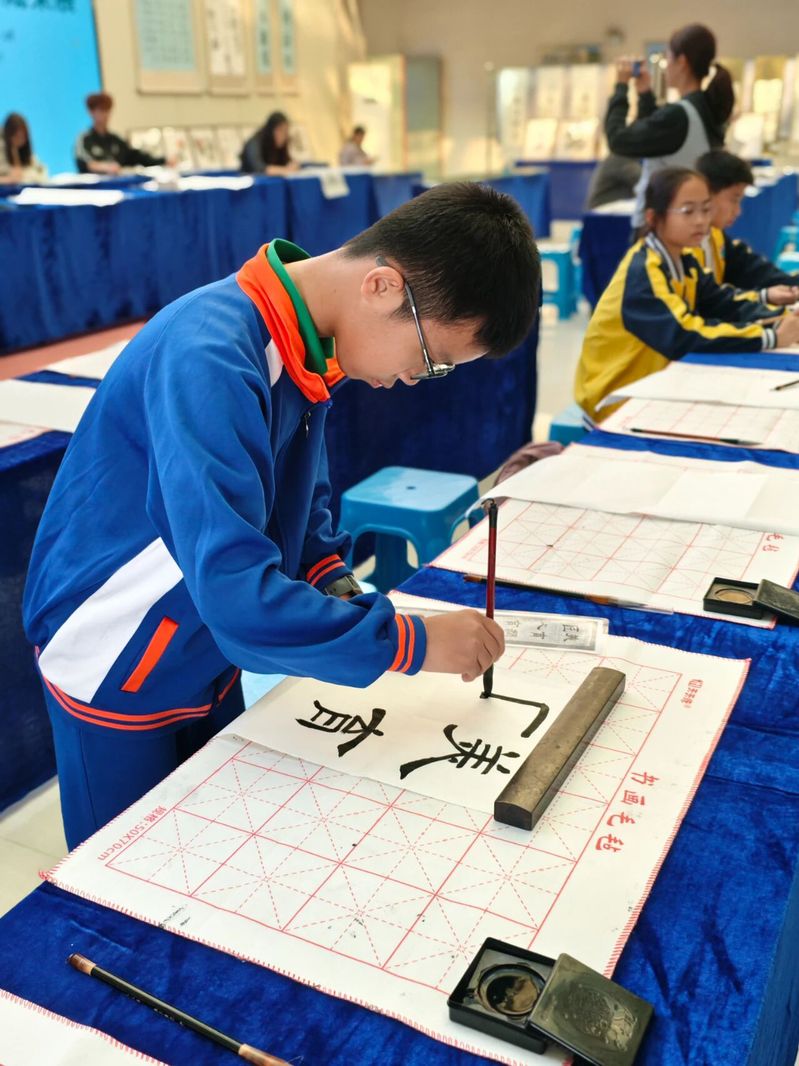 10:30,书法专场的师生齐聚致远楼一楼。墨香盈室,笔意流转,学生在专业教师指导下开展现场实训,一撇一捺间勾勒出汉字之美,传统书写艺术在少年手中焕发新生。下午的活动在书画展中继续展开。14:30,全体与会人员移步展区,参观师生书画作品。一幅幅色彩斑斓的绘画、一件件笔力遒劲的书法,不仅是技艺的展示,更是美育浸润成果的生动缩影。现场书法展示环节,师生同台挥毫,气氛雅致而热烈。