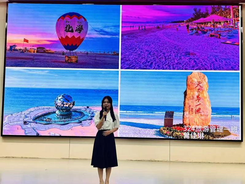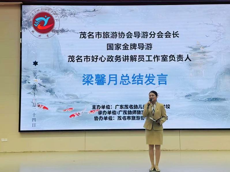 为深化旅游专业实践教学,提升学生导游服务能力,传承中华优秀文旅文化,旅游生态学院于11月24日在茂名校区闻韶苑举办导游大赛决赛。本次决赛的评委有茂名市旅游协会导游分会会长梁馨月,旅游生态学院党总支书记冼周、副院长彭章宏、办公室主任谢红虹、战赤嘉老师、王璐老师。324、325导游和旅游管理专业学生到现场观赛,共同感受这场融合专业与热爱的文旅盛宴。黄琳、陈佳鹏同学主持本场大赛。