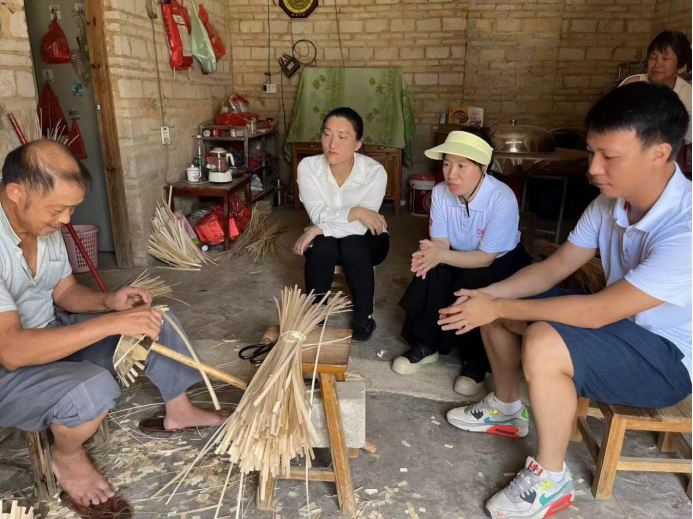 2024年7月,田飞老师担任省青年大学生“百千万工程”非遗寻宝突击队指导老师,与信宜怀乡镇结对开展竹编产业帮扶。她带领团队调研破解产业瓶颈,为5家竹编工厂提供产品设计,通过线上直播、线下摆摊等多元渠道推广,月浏览量达9459次,有效提升产品销量。某农户月收入从2949元增至3744元,既守护了竹编非遗传承,也助力农户稳定增收、巩固脱贫成果。