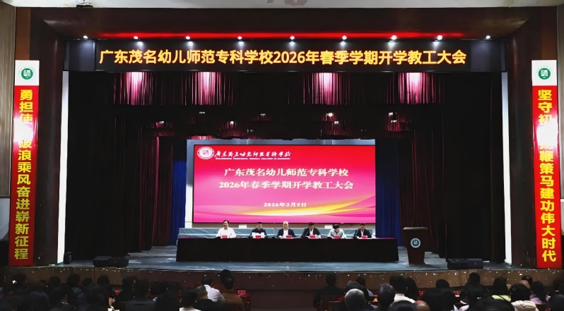 万紫千红到,正月春意浓。2026年3月5日,广东茂名幼儿师范专科学校在高州校区会堂举行2026年春季学期开学教工大会。学校党委书记余义才,党委副书记、校长姚大斌,党委专职副书记吴月明,党委委员、纪委书记莫明波,党委委员、副校长吴东,党委委员、副校长吴标,全体中层干部以及全体教职工参加会议。会议由姚大斌主持。