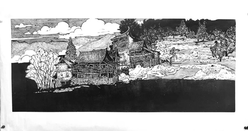 (《山居无尘·谧境有声》木刻版画) )
