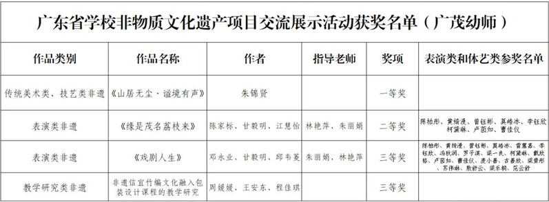 近日,广东省教育厅关于公布了广东省学校非物质文化遗产项目交流展示活动获奖名单,我校师生积极参与,凭借全面的专业素养与出色的创作能力,在本次活动中荣获一等奖1项、二等奖1项、三等奖2项,学校荣获“优秀组织奖”。