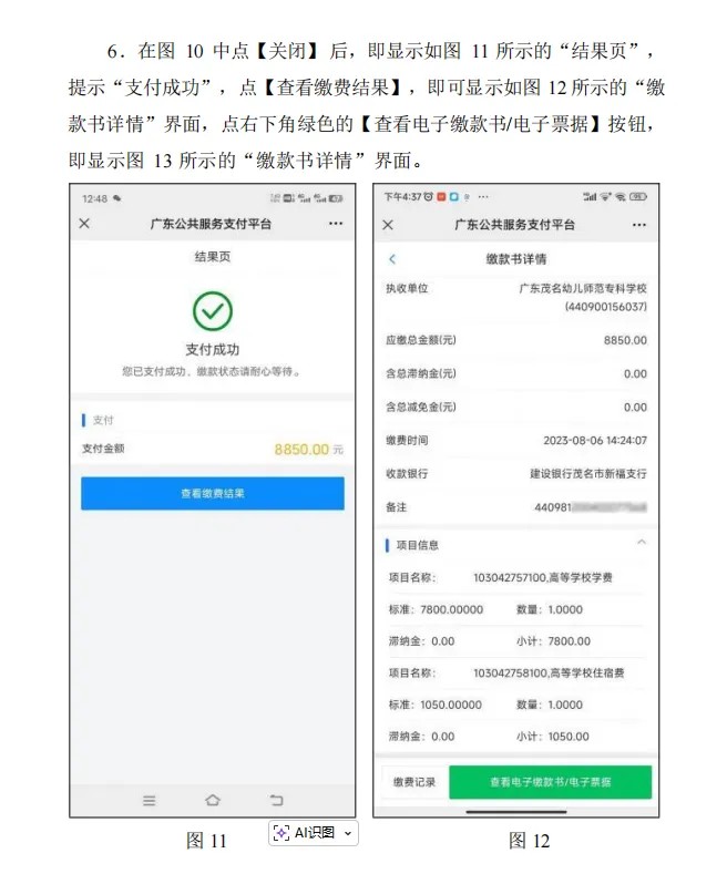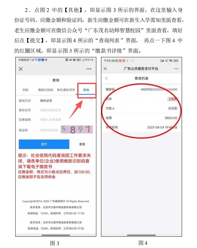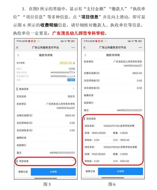 1.慎防网络诈骗!我校官方公众号为“广东茂名幼师”或“广茂幼师招生就业办”。本缴费系统与五年一贯制报名系统的缴费状态不实时关联,考生只需确认缴费成功并截留“已缴费”界面保存备查即可,无需在意报名系统中的缴费状态。