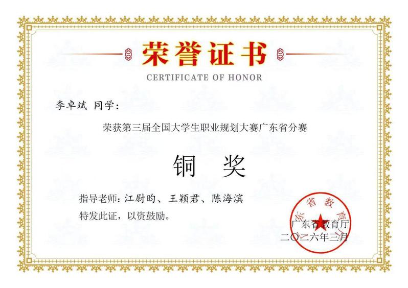 全国职业规划大赛是目前全国规格最高、覆盖面最广、影响力最大的职业规划类赛事。备赛期间,江尉昀、王颖君、陈海滨三位指导老师从职业认知、规划书打磨、答辩模拟等方面全流程精准辅导,倾力护航。李卓斌同学立足旅游管理专业,明确职业方向、细化成长路径,将专业学习与职业理想紧密结合,充分展现了我学子勤学善思、追求卓越的精神风貌。