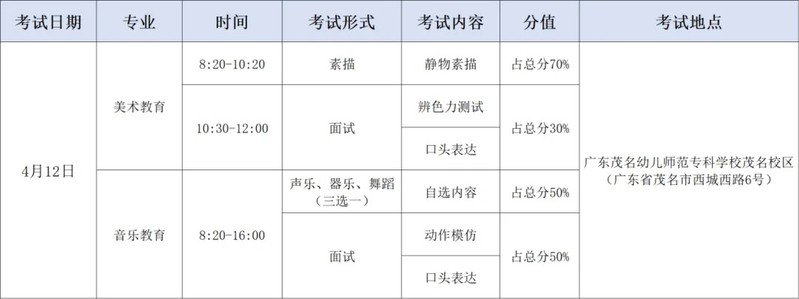 四、音乐教育术科考试时间:4月12日8:20-16:00,随到随考,如考生晚于16:00到达考场,则不得进入考场参加考试。考生须携带有效身份证、准考证及考试用品按时参加考试,考场仅提供钢琴、G调D调古筝、架子鼓。选考声乐或舞蹈的考生,可自备小型音乐播放器/U盘,考场提供钢琴伴奏(需自带歌谱)。报到地点:实训中心行知2号楼一楼致新厅;咨询电话:0668-3383368。