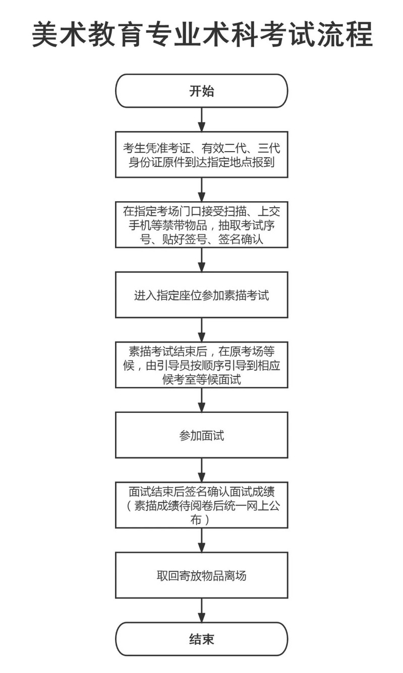 五、美术教育术科考试时间:4月12日,素描8:20-10:20,面试10:30-12:00;请在8:20准时参加素描术科考试。请提前1小时以上到达荟文广场查看试室号,然后排队等待进入考场。术科考试须携带有效身份证、准考证、四开画板及绘画工具,考场仅提供画架、画纸。咨询电话:0668-3383833。