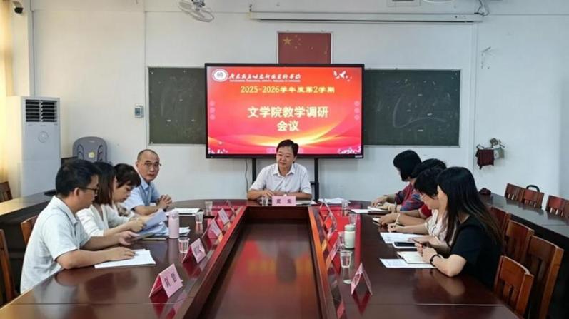 2026年4月20日,文学院在高州校区教学楼401会议室召开教学调研专题工作会议。学校党委委员、副校长吴东,教务部部长黎雪琼出席会议。会议分两个阶段进行,第一阶段由文学院党总支部书记苏文胜主持、第二阶段由行政负责人田飞主持。